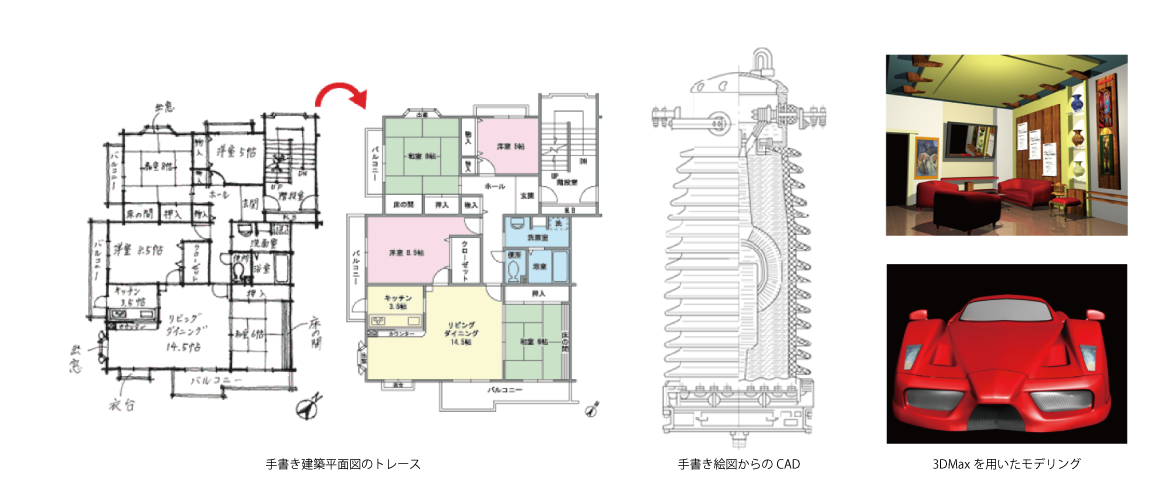 CAD設計を始める前の紙ベースの建築や機械などの手書き設計図やイラストをAdobe Illustrator やCAD及び高度な3Dモデリングやアニメーションを作成する3DS Maxで作成致します。